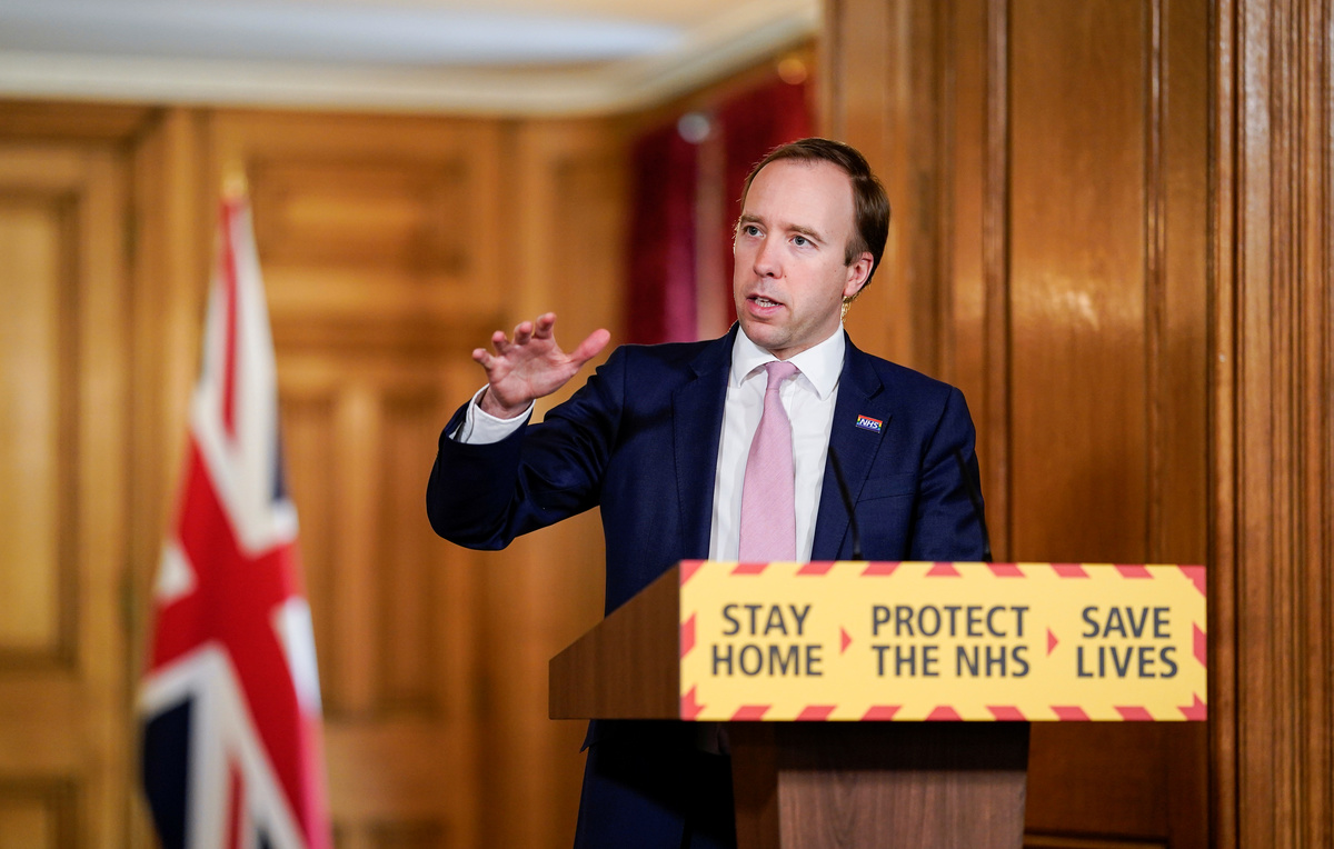 Britain's Health Secretary Matt Hancock chairs the Daily COVID-19 Digital News Conference with Deputy Chief Medical Officer, Professor Jonathan Van-Tam and Professor of Public Health & Epidemiology, Coordinator of the National Testing Effort, Professor John Newton to update on the coronavirus disease (COVID-19) outbreak, at 10 Downing Street in London, Britain May 4, 2020. Andrew Parsons/10 Downing Street/Handout via REUTERS