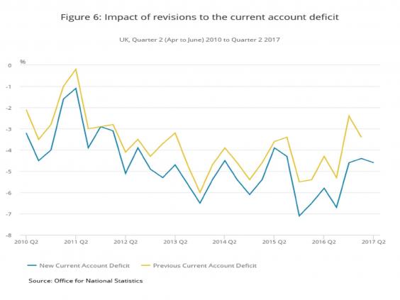 The ONS also reported that the current account deficit for the second quarter of 2017 widened to £23.1bn, equal to around 4.6 per cent of GDP over the period.