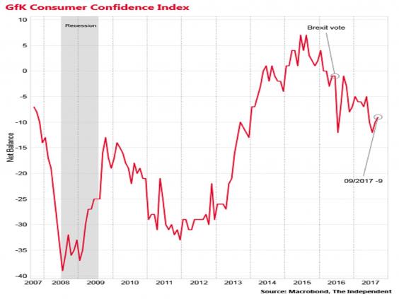 One series from GfK shows that there has been a slip since the start of the year and it fell to its lowest level since the 2016 Brexit referendum in July (minus 12).