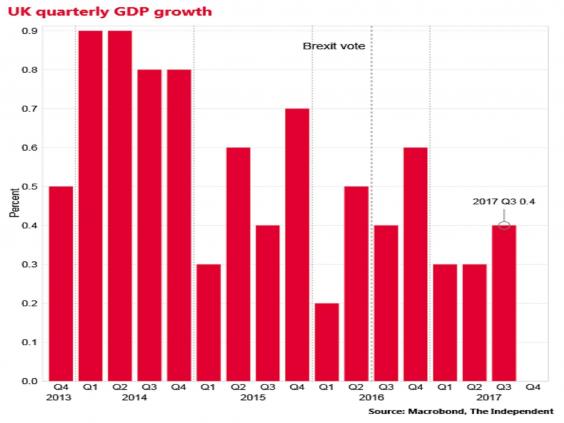 Though the pace of GDP growth picked up slightly to 0.4 per cent in the third quarter of 2017, according to the ONS’s early estimate, this is below the 0.6 per cent rate seen at the end of 2016.