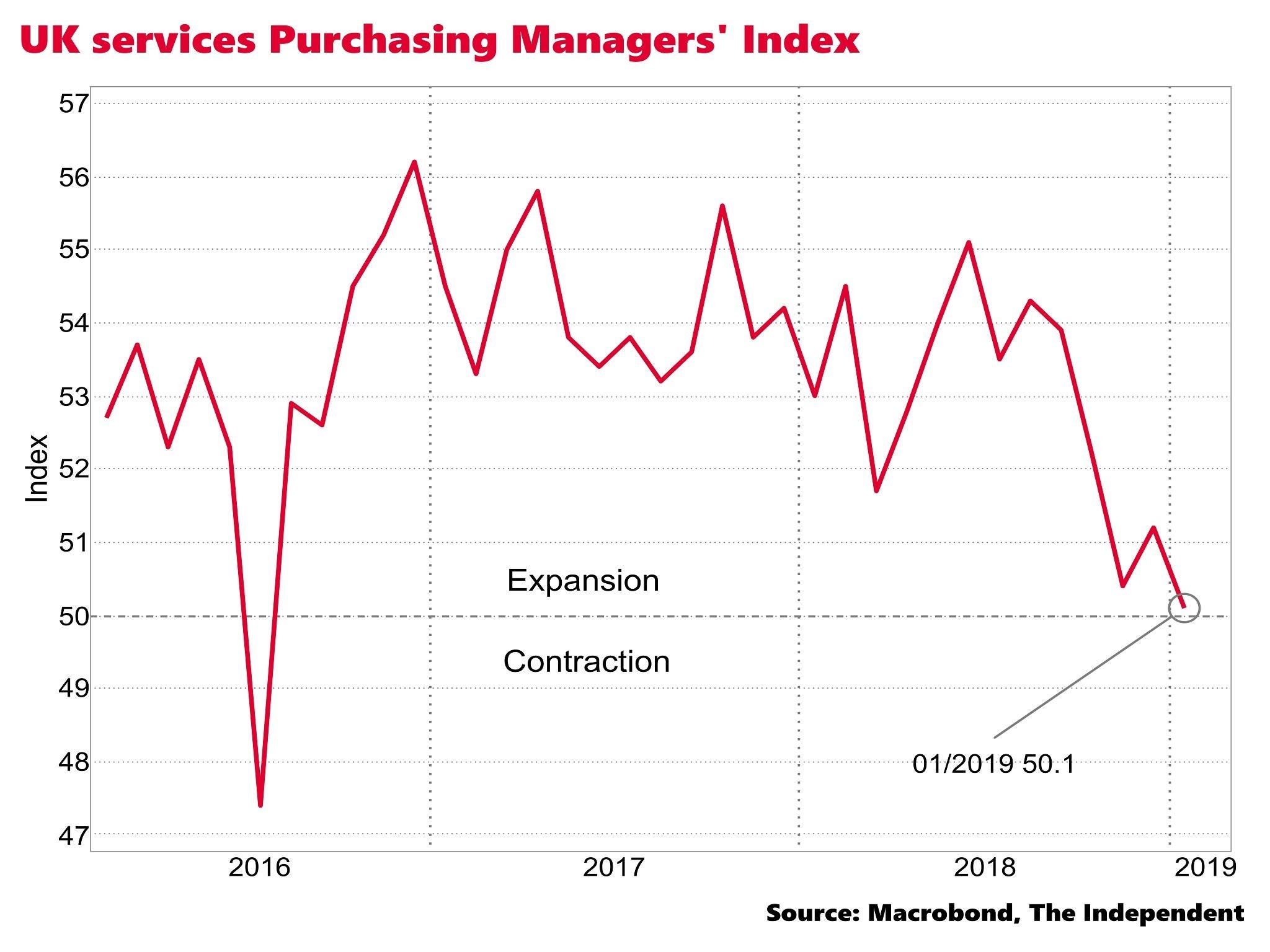 The Purchasing Managers’ Index came in at 50.1, the weakest since the aftermath of the 2016 Brexit vote and only just above the 50 mark that separates growth from contraction.