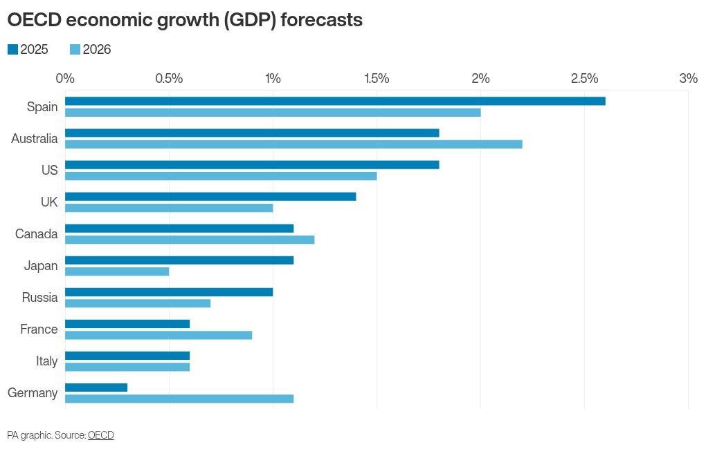 The Organisation of Economic Co-operation and Development (OECD) said Britain’s “tighter fiscal stance”, meaning higher taxes and reduced government spending, is expected to weigh on the economy, with growth set to ease sharply from 1.4% this year to 1% in 2026.