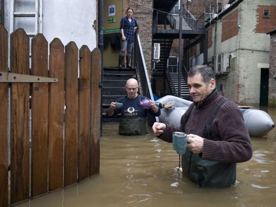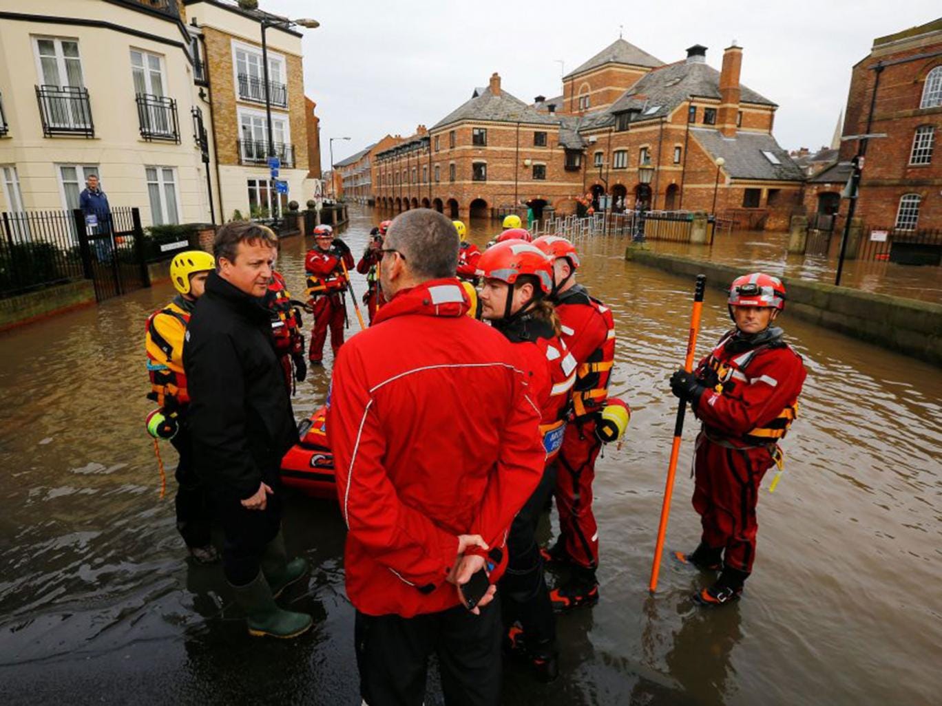 As Mr Cameron flew by helicopter into York he met emergency workers in the city who have between them evacuated 114 evacuated homes, but was heckled by a woman who shouted “no more cuts to public services”. On Sunday the Environment Agency took the controversial decision to open a flood barrier – deluging a new area of the city – to prevent damage being done to an adjoining pumping station.