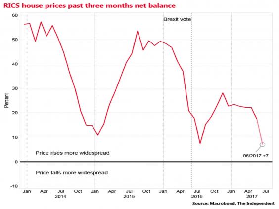 The Royal Institution of Chartered Surveyor’s (RICS) headline price balance fell to +7 per cent in the month down from +17 per cent in May and the weakest reading since immediately after the Brexit vote in 2016.