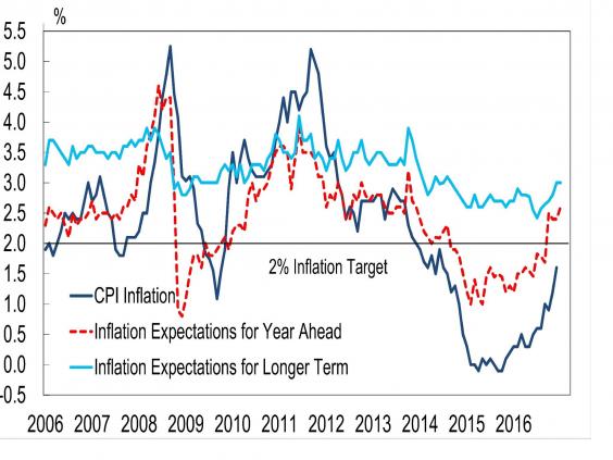 In November, the Bank predicted that inflation would surpass 2.7 per cent by the end of 2017, spurred by a fall in the value of sterling since the UK’s June vote to quit the European Union.