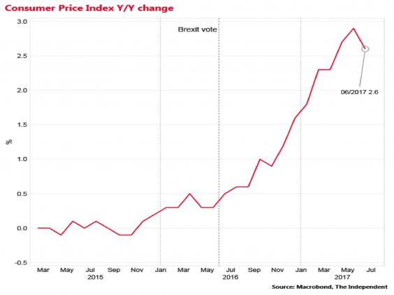 Inflation had been rising sharply since last year's Brexit vote, largely owing to the 13 per cent slump in the pound in the wake of the referendum, which has sent import prices up dramatically.