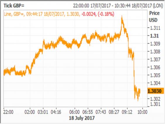 The pound dropped sharply to $1.3030, down 0.18 per cent on the day, in response to the figures, as many traders bet that the surprise slowdown would limit the likelihood of a rate hike next month by the Bank of England.
