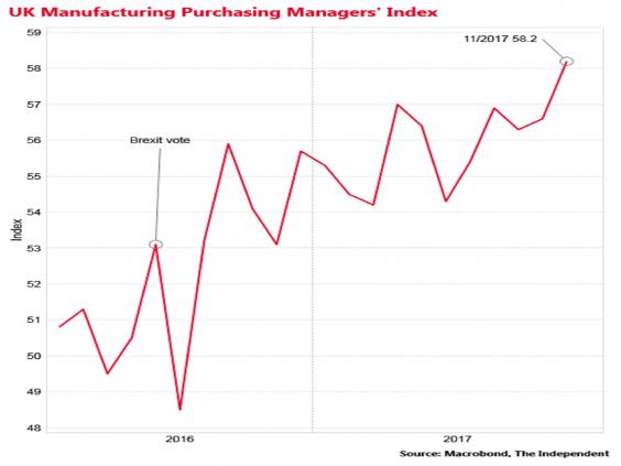 The Purchasing Managers' Index jumped to 58.2 in the month, up from 56.6 in October and well above the 56.5 that City of London analysts had expected.