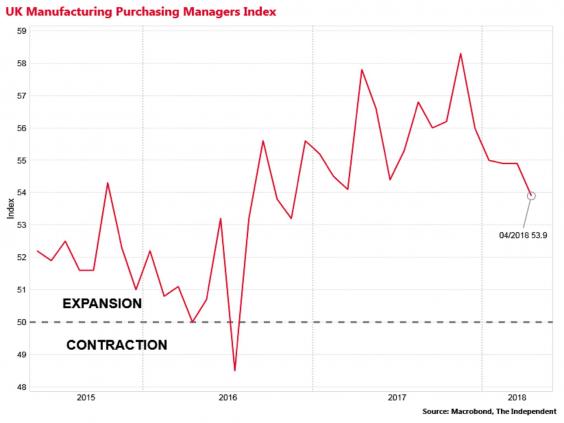 Manufacturing accounts for 10 per cent of UK GDP, and the Office for National Statistics (ONS) estimated last week that the sector slowed dramatically in the three months to March, expanding by just 0.2 per cent, after booming in the second half of 2017, which was helped by the weaker pound.