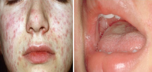 Infections begins with flu like symptoms and with small spots visible inside the cheeks, the characteristic red-brown blotchy rash appears a few days later, beginning around the head and neck.