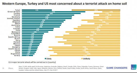 “Britons are the most likely to expect a major terrorist attack in 2018, while two in five think a war between the US and North Korea is likely.