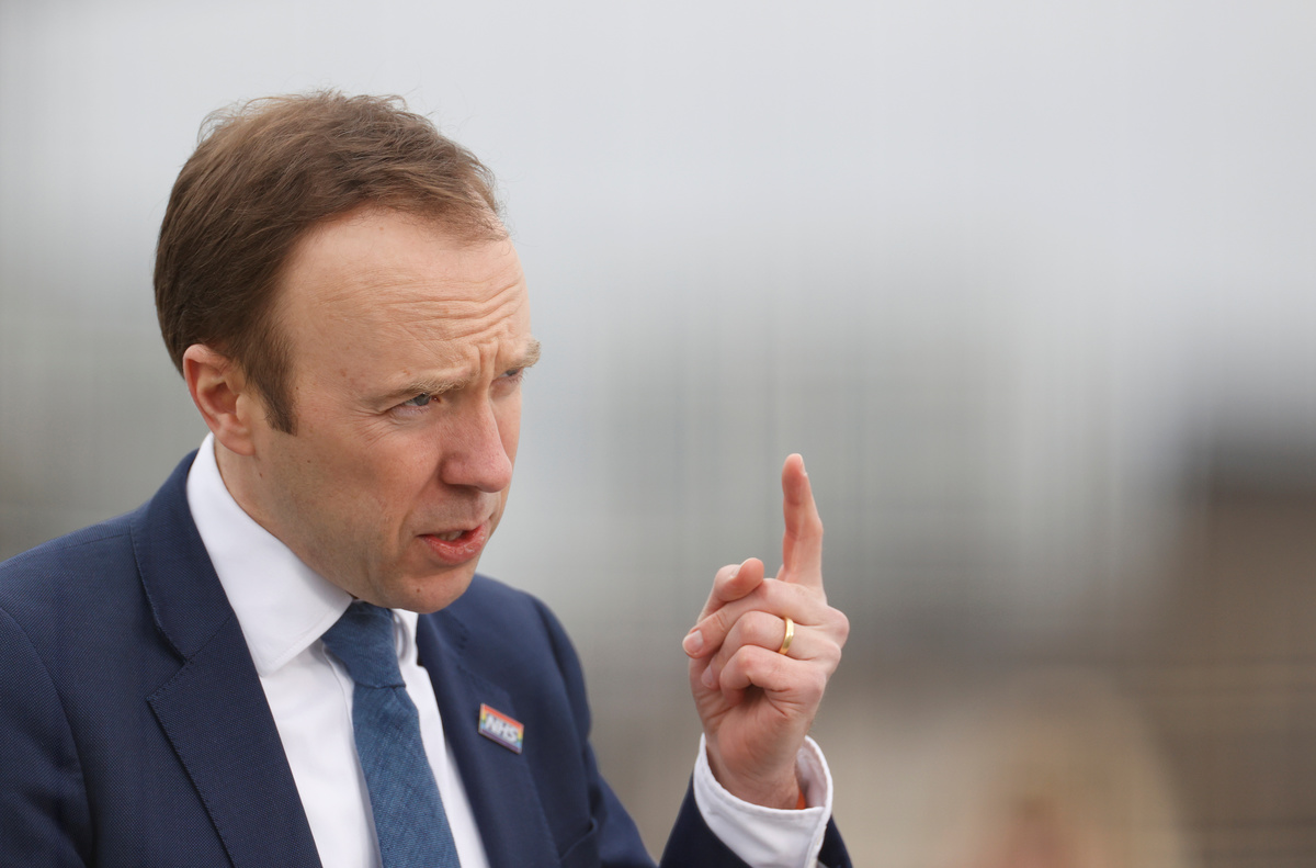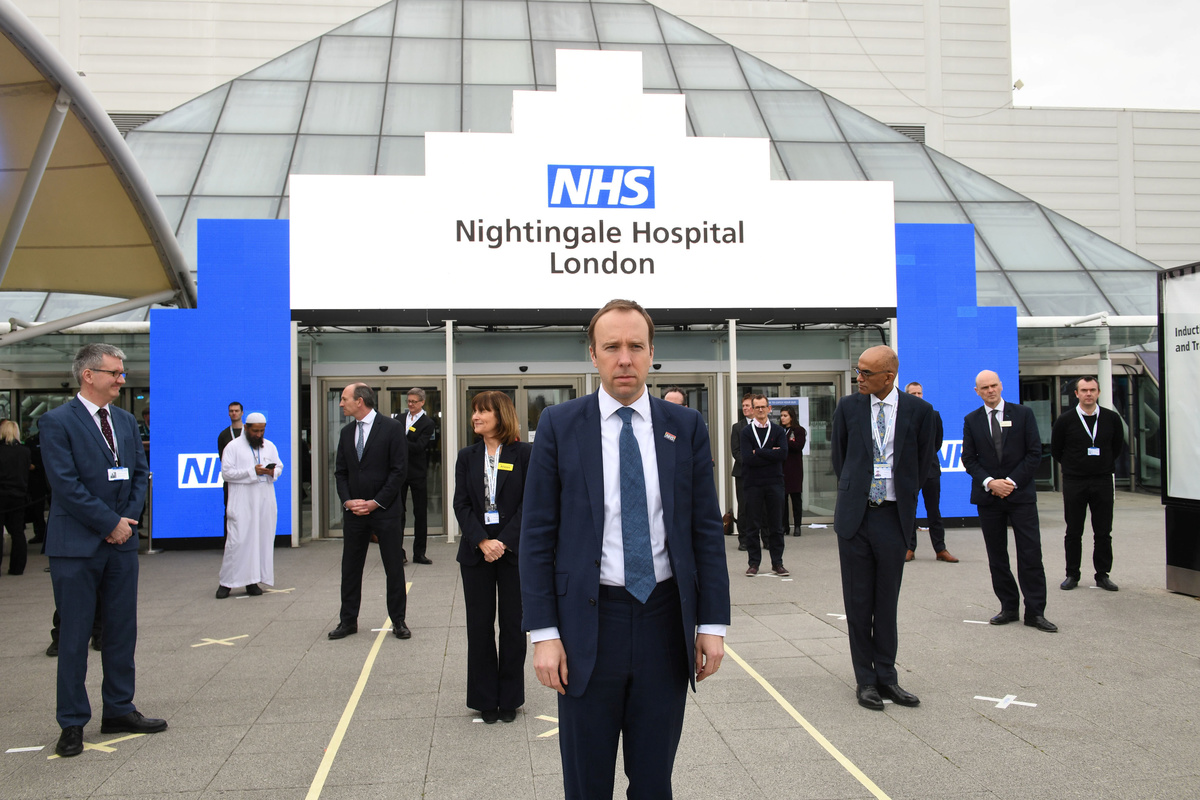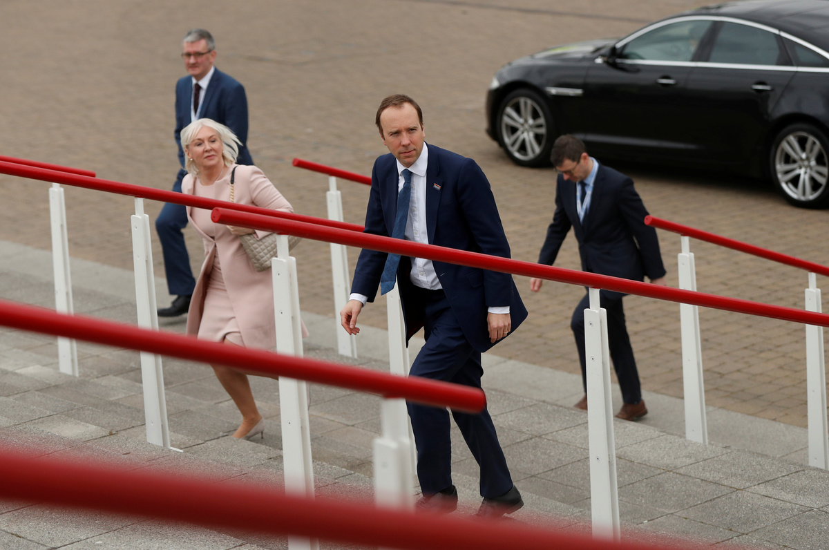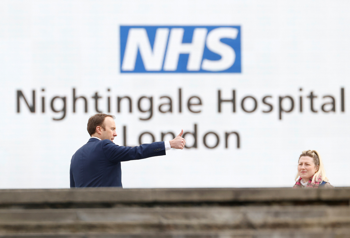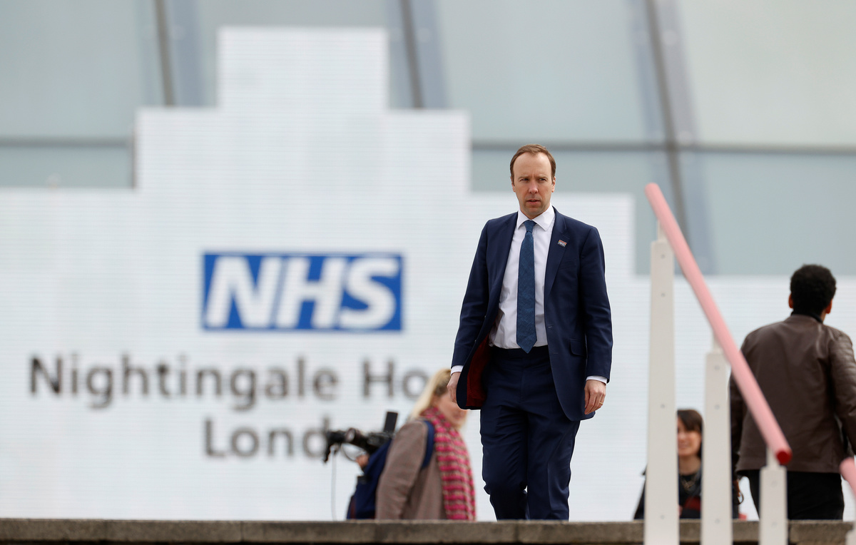 Britain's Secretary of State for Health Matt Hancock after the opening of the NHS Nightingale Hospital as the spread of the coronavirus disease (COVID-19) continues, London, Britain, April 3, 2020. REUTERS/John SibleyFILE PHOTO: Members of the Military outside the NHS Nightingale hospital as the spread of the coronavirus disease (COVID-19) continues, London, Britain April 2, 2020. REUTERS/Paul Childs/File Photo Britain's Secretary of State for Health Matt Hancock speaks during the opening of the NHS Nightingale Hospital as the spread of the coronavirus disease (COVID-19) continues, London, Britain, April 3, 2020. REUTERS/John Sibley Nadine Dorries, MP looks at a phone during the opening of the NHS Nightingale Hospital as the spread of the coronavirus disease (COVID-19) continues, London, Britain, April 3, 2020. REUTERS/John Sibley Britain's Secretary of State for Health Matt Hancock arrives at the NHS Nightingale Hospital as the spread of the coronavirus disease (COVID-19) continues, London, Britain, April 3, 2020. REUTERS/John Sibley Britain's Secretary of State for Health Matt Hancock applauds during the opening of the NHS Nightingale Hospital as the spread of the coronavirus disease (COVID-19) continues, London, Britain, April 3, 2020. REUTERS/John Sibley Britain's Secretary of State for Health Matt Hancock arrives at the NHS Nightingale Hospital as the spread of the coronavirus disease (COVID-19) continues, London, Britain, April 3, 2020. REUTERS/John Sibley