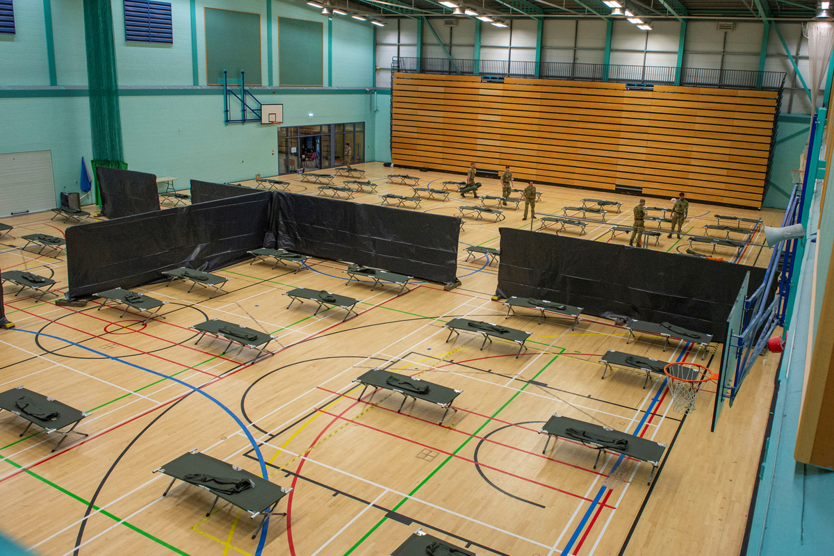 Soldiers set up additional beds in Penrith Leisure Centre as part of the response to the coronavirus disease (COVID-19) outbreak in Penrith, Britain April 1, 2020. Picture taken April 1, 2020. MINISTRY OF DEFENCE via REUTERS THIS IMAGE HAS BEEN SUPPLIED BY A THIRD PARTY. NO RESALES. NO ARCHIVES. MANDATORY CREDIT