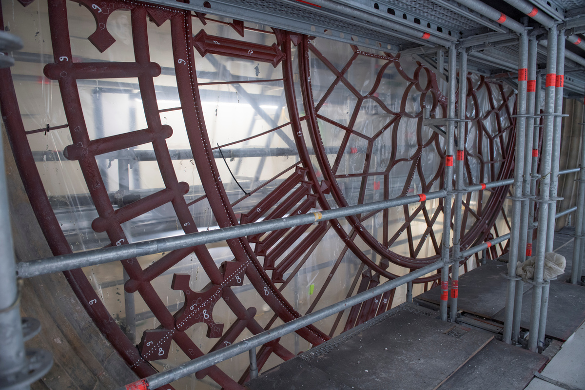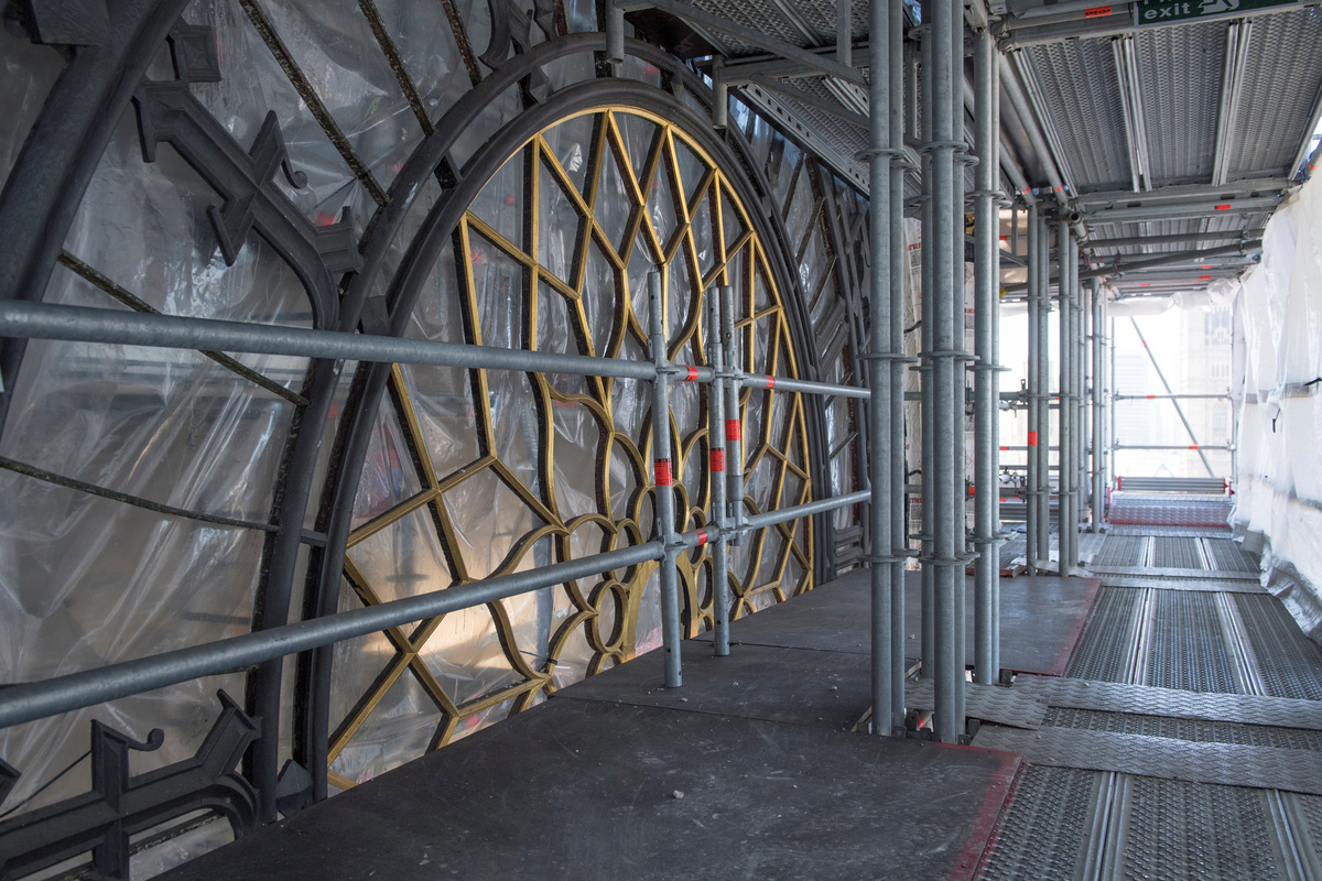 The Victorian clock mechanism has been removed to be serviced and to ensure it is not damaged by dust and dirt generated during the works, with an electric motor installed to drive the clock's 4.2 metre-long hands while it is gone.