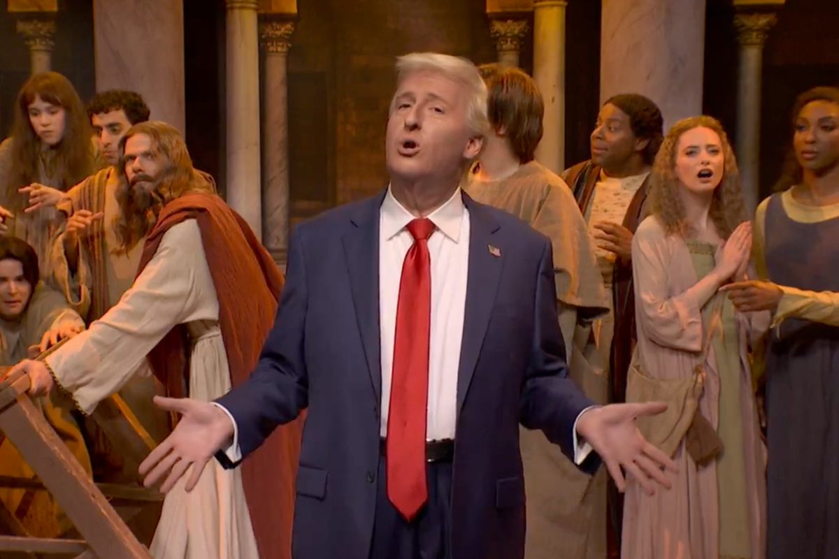 James Austin Johnson returned to Studio 8H at 30 Rockefeller Plaza as the president in an Easter-themed sketch that began with Jesus, played by Mikey Day, casting the moneylenders out of the temple on his arrival in Jerusalem.