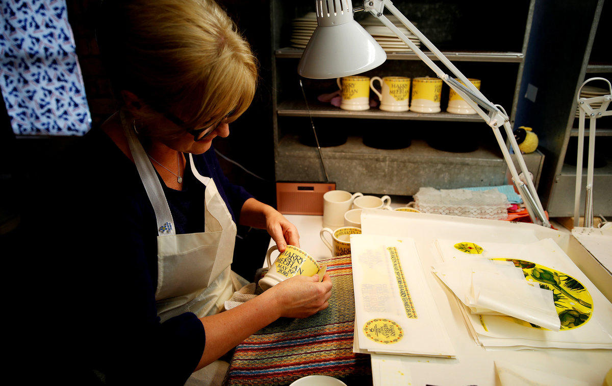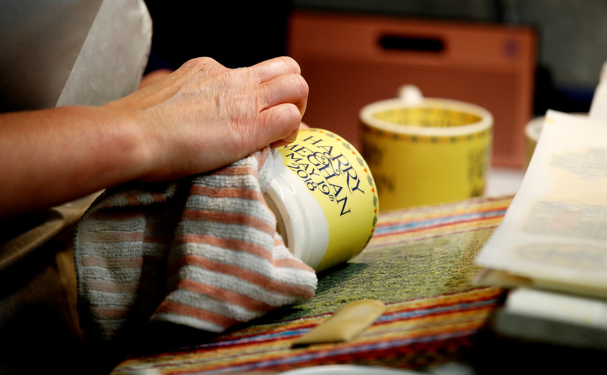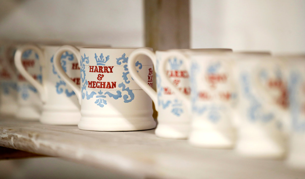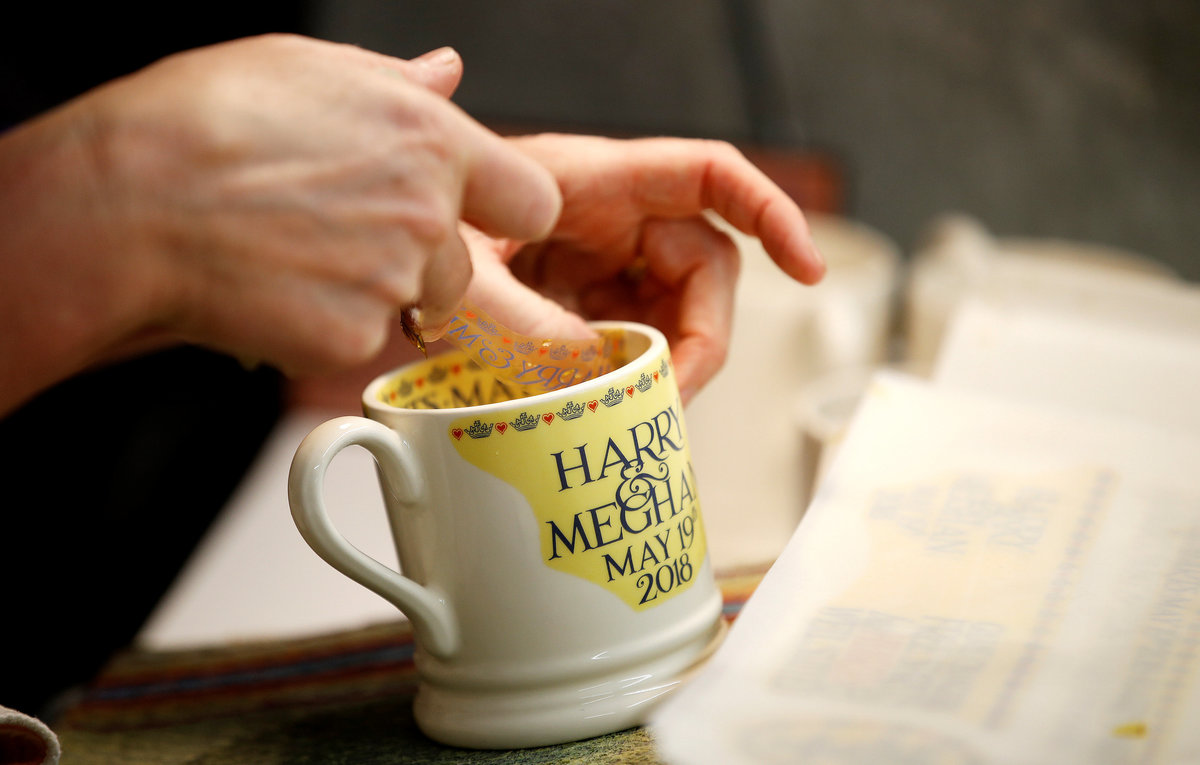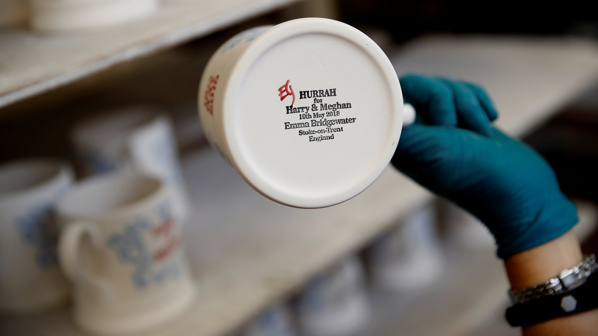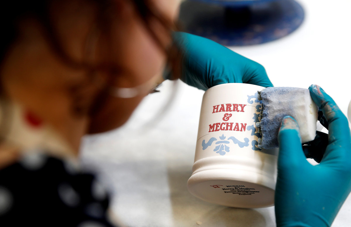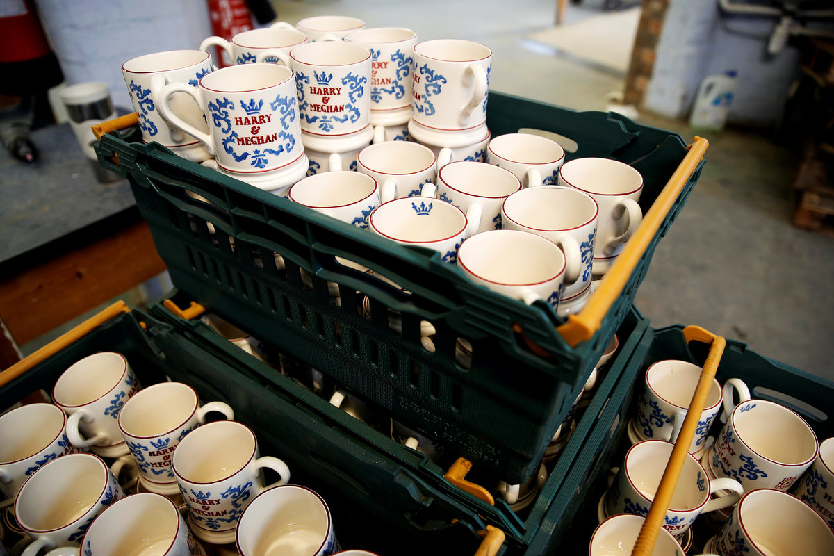 A worker adds transfers to mugs commemorating the wedding of Britain's Prince Harry and Meghan Markle at the Emma Bridgewater Factory, in Hanley, Stoke-on-Trent, Britain March 28, 2018. REUTERS/Carl RecineClay is injected into moulds to make mugs commemorating the wedding of Britain's Prince Harry and Meghan Markle at the Emma Bridgewater Factory, in Hanley, Stoke-on-Trent, Britain March 28, 2018. REUTERS/Carl RecineThe factory stamp and decorator's initials are seen on the bottom of a mug produced to commemorate the wedding of Britain's Prince Harry and Meghan Markle are being made at the Emma Bridgewater Factory, in Hanley, Stoke-on-Trent, Britain March 28, 2018. REUTERS/Carl RecineA worker uses stamps and paint to add part of the design to mugs commemorating the wedding of Britain's Prince Harry and Meghan Markle at the Emma Bridgewater Factory, in Hanley, Stoke-on-Trent, Britain March 28, 2018. REUTERS/Carl RecineMugs commemorating the wedding of Britain's Prince Harry and Meghan Markle wait to be glazed at the Emma Bridgewater Factory, in Hanley, Stoke-on-Trent, Britain March 28, 2018. REUTERS/Carl RecineA worker adds transfers to mugs commemorating the wedding of Britain's Prince Harry and Meghan Markle at the Emma Bridgewater Factory, in Hanley, Stoke-on-Trent, Britain March 28, 2018. REUTERS/Carl RecineFreshly cast mugs commemorating the wedding of Britain's Prince Harry and Meghan Markle wait to be fired at the Emma Bridgewater Factory, in Hanley, Stoke-on-Trent, Britain March 28, 2018. REUTERS/Carl RecineA worker adds transfers to mugs commemorating the wedding of Britain's Prince Harry and Meghan Markle at the Emma Bridgewater Factory, in Hanley, Stoke-on-Trent, Britain March 28, 2018. REUTERS/Carl Recine