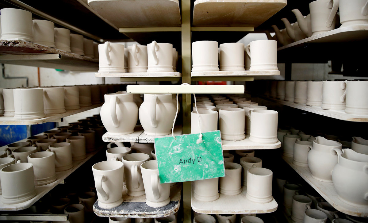Mugs commemorating the wedding of Britain's Prince Harry and Meghan Markle wait to be glazed at the Emma Bridgewater Factory, in Hanley, Stoke-on-Trent, Britain March 28, 2018. REUTERS/Carl Recine
