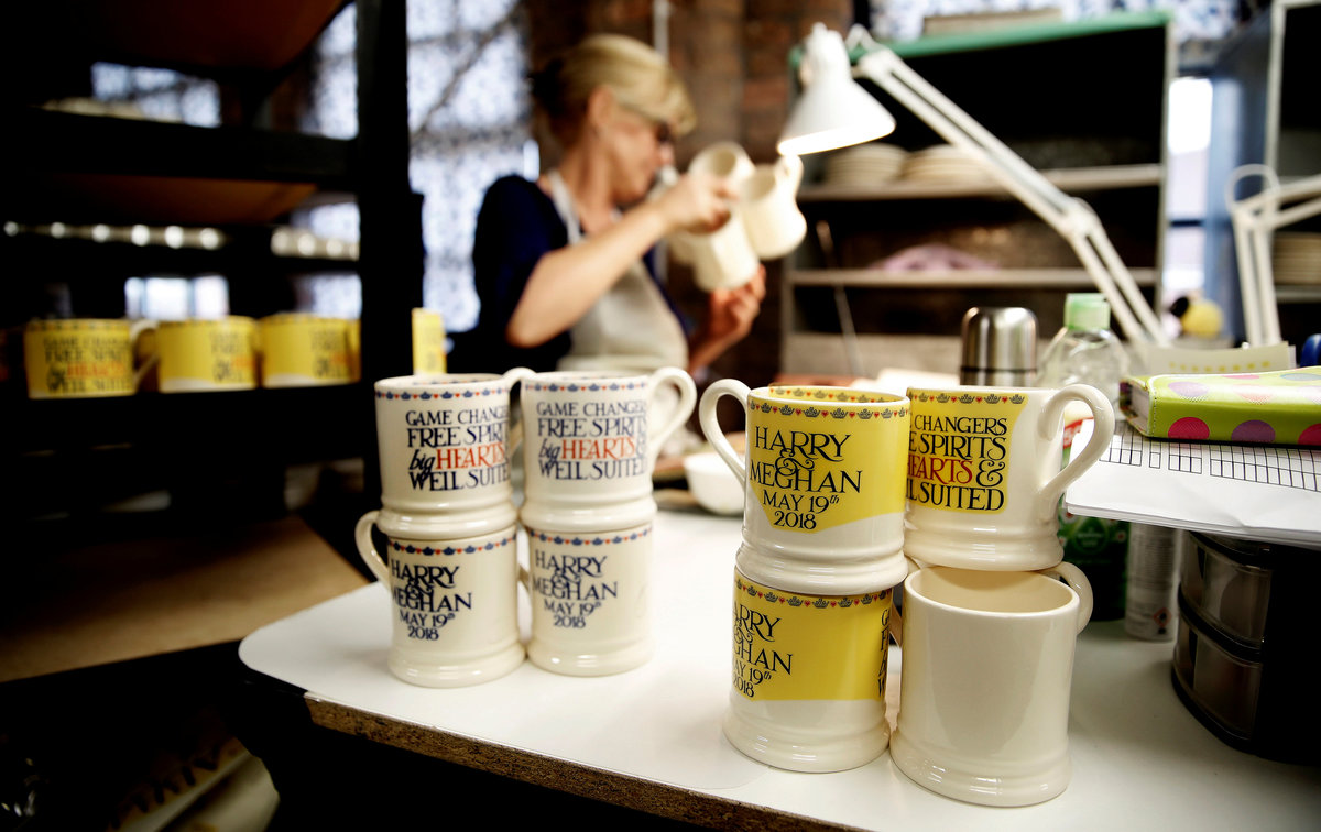 A worker adds transfers to mugs commemorating the wedding of Britain's Prince Harry and Meghan Markle at the Emma Bridgewater Factory, in Hanley, Stoke-on-Trent, Britain March 28, 2018. REUTERS/Carl RecineA worker prints a design onto a souvenir mug to commemorate the wedding of Britain's Prince Harry and Meghan Markle at the Emma Bridgewater Factory, in Hanley, Stoke-on-Trent, Britain March 28, 2018. REUTERS/Carl RecineA portrait of Britain's Queen Elizabeth hangs in the Decorating Studio where mugs to commemorate the wedding of Britain's Prince Harry and Meghan Markle are being made at the Emma Bridgewater Factory, in Hanley, Stoke-on-Trent, Britain March 28, 2018. REUTERS/Carl RecineA worker makes a stamp to add part of the design to mugs commemorating the wedding of Britain's Prince Harry and Meghan Markle at the Emma Bridgewater Factory, in Hanley, Stoke-on-Trent, Britain March 28, 2018. REUTERS/Carl RecineFreshly cast mugs commemorating the wedding of Britain's Prince Harry and Meghan Markle wait to be fired at the Emma Bridgewater Factory, in Hanley, Stoke-on-Trent, Britain March 28, 2018. REUTERS/Carl RecineA worker adds transfers to mugs commemorating the wedding of Britain's Prince Harry and Meghan Markle at the Emma Bridgewater Factory, in Hanley, Stoke-on-Trent, Britain March 28, 2018. REUTERS/Carl RecineSouvenir mugs to commemorate the wedding of Britain's Prince Harry and Meghan Markle are stacked at the Emma Bridgewater Factory, in Hanley, Stoke-on-Trent, Britain March 28, 2018. REUTERS/Carl RecineThe factory stamp and decorator's initials are seen on the bottom of a mug produced to commemorate the wedding of Britain's Prince Harry and Meghan Markle are being made at the Emma Bridgewater Factory, in Hanley, Stoke-on-Trent, Britain March 28, 2018. REUTERS/Carl RecineA worker adds transfers to mugs commemorating the wedding of Britain's Prince Harry and Meghan Markle at the Emma Bridgewater Factory, in Hanley, Stoke-on-Trent, Britain March 28, 2018. REUTERS/Carl RecineA worker adds transfers to mugs commemorating the wedding of Britain's Prince Harry and Meghan Markle at the Emma Bridgewater Factory, in Hanley, Stoke-on-Trent, Britain March 28, 2018. REUTERS/Carl RecineA worker uses stamps and paint to add part of the design to mugs commemorating the wedding of Britain's Prince Harry and Meghan Markle at the Emma Bridgewater Factory, in Hanley, Stoke-on-Trent, Britain March 28, 2018. REUTERS/Carl RecinePlugs are placed on moulds for mugs being made to commemorate the wedding of Britain's Prince Harry and Meghan Markle at the Emma Bridgewater Factory, in Hanley, Stoke-on-Trent, Britain March 28, 2018. REUTERS/Carl RecineClay is injected into moulds to make mugs commemorating the wedding of Britain's Prince Harry and Meghan Markle at the Emma Bridgewater Factory, in Hanley, Stoke-on-Trent, Britain March 28, 2018. REUTERS/Carl RecineCharlie the factory dog wanders around the decorating Studio as staff work on souvenir mugs to commemorate the wedding of Britain's Prince Harry and Meghan Markle at the Emma Bridgewater Factory, in Hanley, Stoke-on-Trent, Britain March 28, 2018. REUTERS/Carl Recine