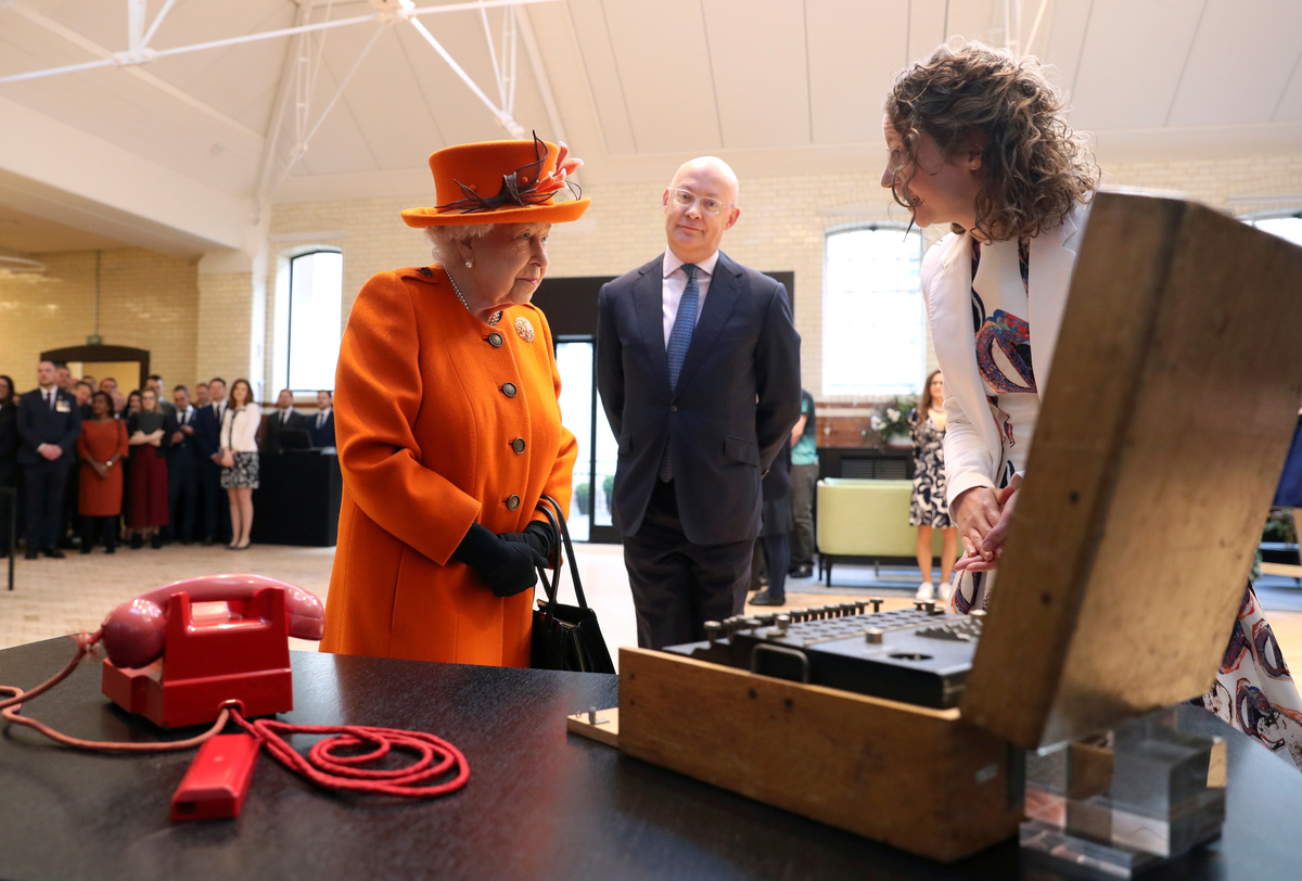 Britain's Queen Elizabeth looks at an Enigma machine at the Smith Centre, as Science Museum Director Ian Blatchford looks on, during a visit to the museum in London, Britain March 7, 2019. REUTERS/Simon Dawson/Pool