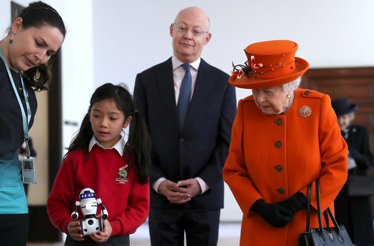 Britain's Queen Elizabeth is shown robotics by children next to Science Museum Director Ian Blatchford during a visit to the museum in London, Britain March 7, 2019. REUTERS/Simon Dawson/Pool