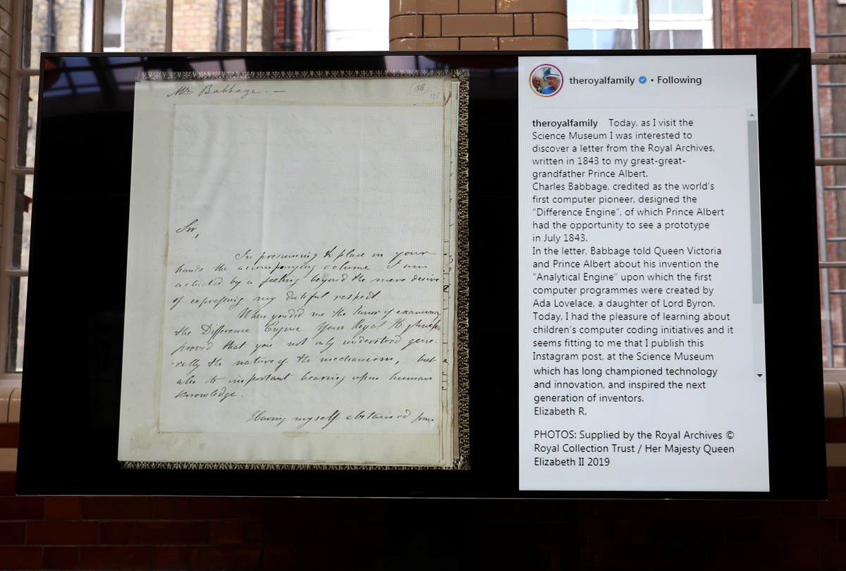 The first Instagram post by Britain's Queen Elizabeth is displayed alongside a letter to Prince Albert, during the queen's visit to the Science Museum in London, Britain March 7, 2019. REUTERS/Simon Dawson/Pool