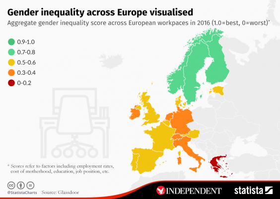 Sweden, Norway, and Finland ranked highest gender equality in the workplace. Italy, Greece and Ireland had the lowest scores.