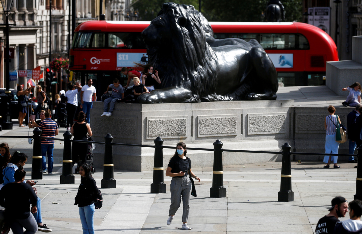 A person wearing a protective face mask walks through Trafalgar Square, amid the coronavirus disease (COVID-19) outbreak, in London, Britain, August 21, 2020. REUTERS/Henry Nicholls