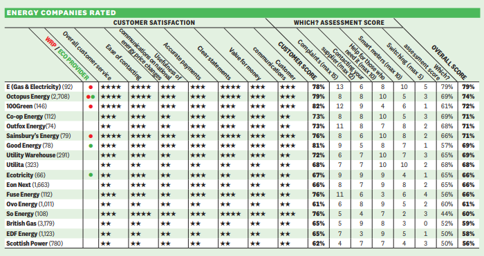 E (Gas and Electricity) received the highest overall score of 79%, receiving four stars for customer service, ease of contacting it and the clarity of its statements.
