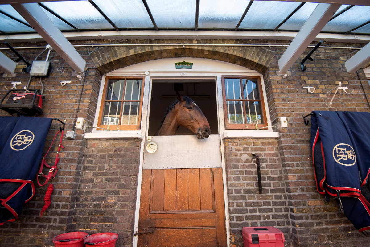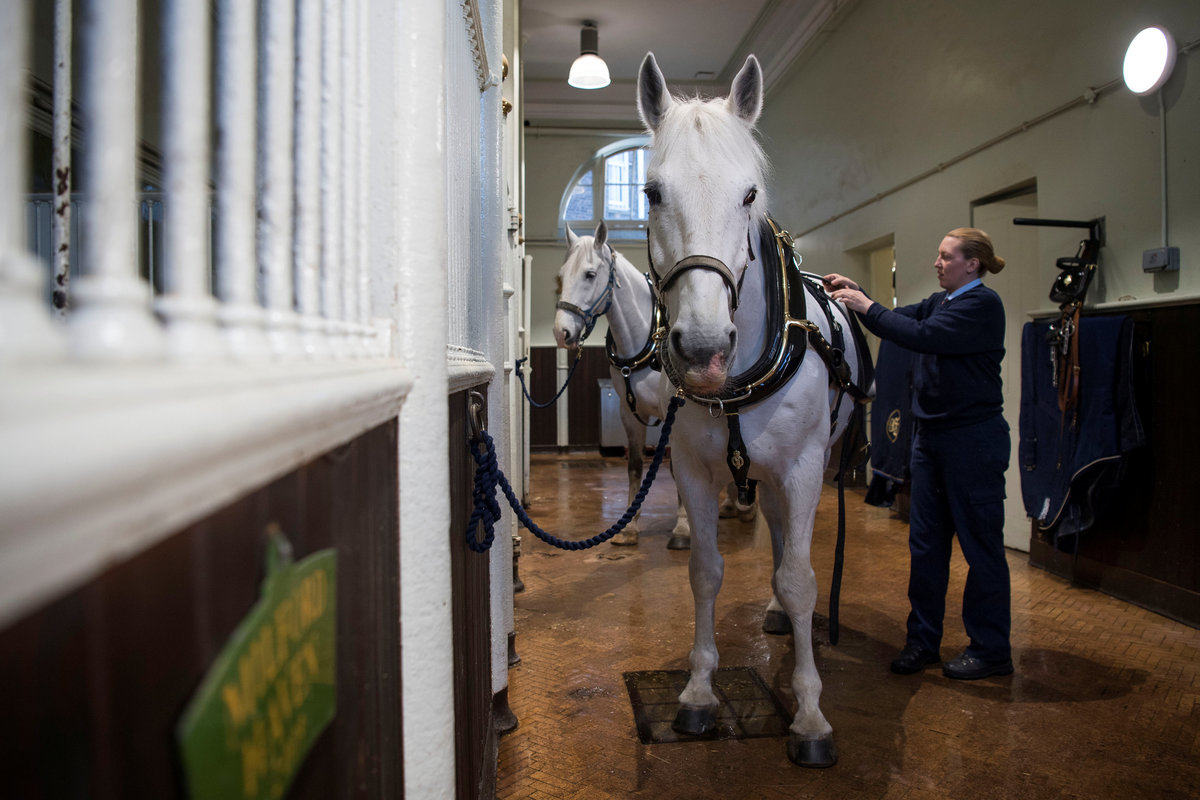 Two Windsor Greys, which will pull the carriage at the wedding of Prince Harry and Meghan Markle, at the Royal Mews at Buckingham Palace, London. Picture taken May 1, 2018. REUTERS/Victoria Jones/Pool