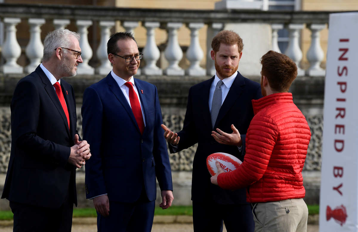 The prince, sixth-in-line to the throne, watched children playing rugby league in the back garden of Buckingham Palace ahead of making the draw for the sport's World Cup next year.