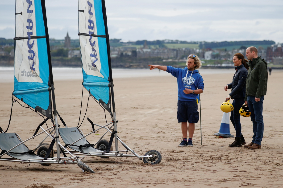 The royal couple, who are currently on a tour of Scotland, went back to the University of St Andrews to hear about how students were coping with the COVID-19 pandemic, while also taking part in land yachting on the nearby beach.