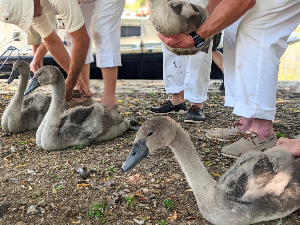 During the Swan Upping, cygnets are plucked from the water, wrestled to shore, measured, checked for disease and marked with a number.