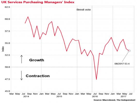 An economic index which tracks the health of the UK’s dominant services sector fell short of expectations in June, rounding off a hat-trick of disappointing industrial surveys and offering "clear" evidence that the economy is losing momentum ahead of Brexit.