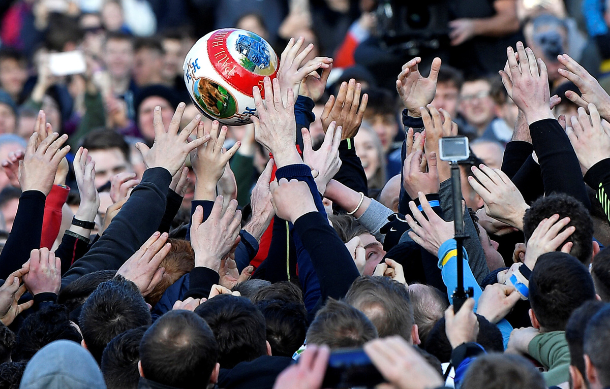 The Royal Shrovetide Football Match involves teams called the Up’ards and the Down’ards, who battle to try and tap the ball three times on stone plinths that act as goals.