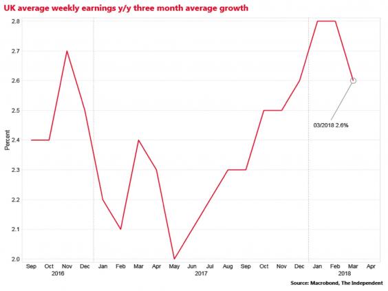 The Office for National Statistics reported on Tuesday that average total earnings grew at an annual rate of by 2.6 per cent in the three months to March, down from the 2.8 per cent rate seen in February.