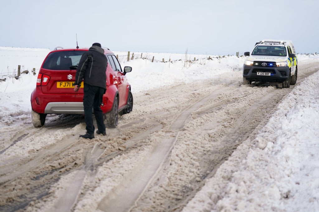 Heavy snow led to lorries getting stuck and ploughs being used in a number of areas, with pub staff and Oasis tribute band Noasis stranded since Friday in the Tan Hill Inn in the Yorkshire Dales as a result of heavy snowfall.