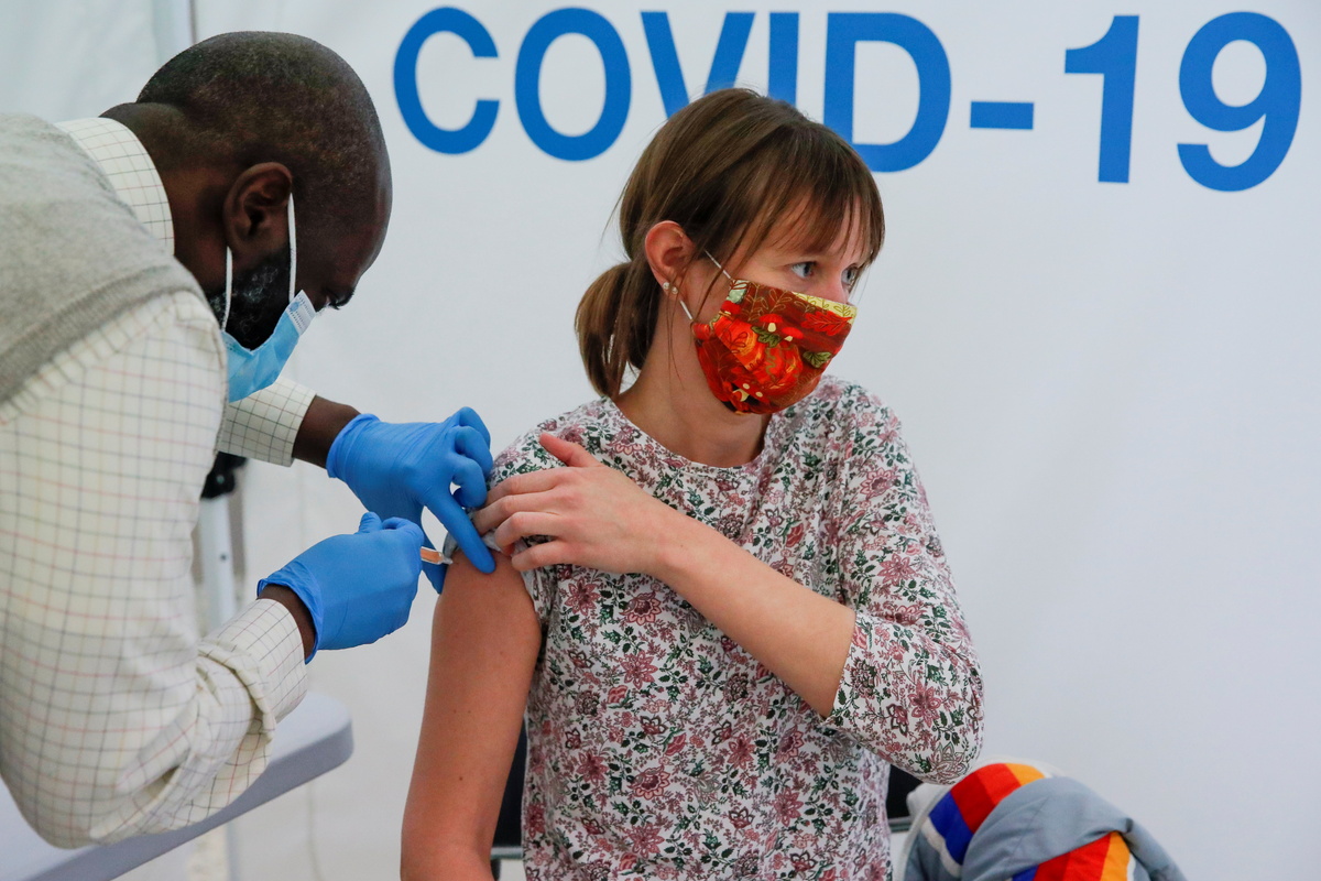 A woman receives a dose of COVID-19 vaccine in a vaccination centre at Newmarket Racecourse, amid the coronavirus disease outbreak in Newmarket, Britain March 26, 2021. REUTERS/Andrew Couldridge