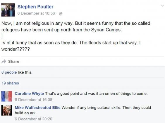 “Now, I am not religious in any way. But it seems funny that the so called refugees have been sent up north from the Syrian Camps,” Mr Poulter wrote on Facebook.