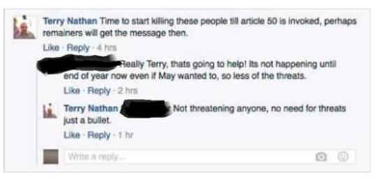 A screenshot of the Facebook comments has been posted into the online group “Worrying Signs”, which has been set up to record incidents of abuse following the Brexit vote.