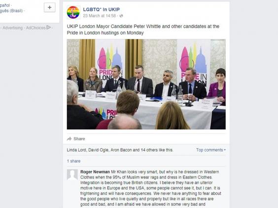 A Ukip councillor appears to have written “anyone but a Muslim” underneath a photo of London Mayoral candidate Sadiq Khan. Cllr Sarah Larkins, Deputy Mayor of Ramsgate, apparently made the comment on the 'LGBTQ* in UKIP' Facebook page. The page had posted a photo from a recent Pride in London hustings between mayoral candidates. In the image, Ukip candidate Peter Whittle is pictured alongside Labour candidate Mr Khan.