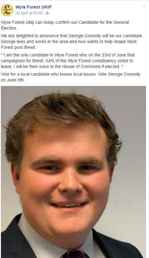 Despite them having announced “We are delighted to announce that George Connolly will be our candidate”, on the Wyre Forest Ukip Facebook page, on 29 April.