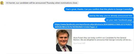 “You have already announced him,” we reminded the people behind the Wyre Forest Ukip Facebook page, “On your own Facebook page.”