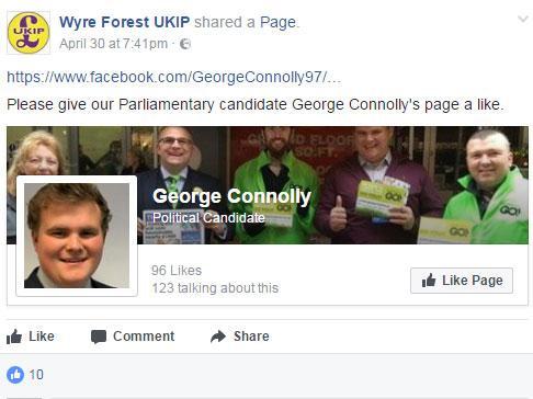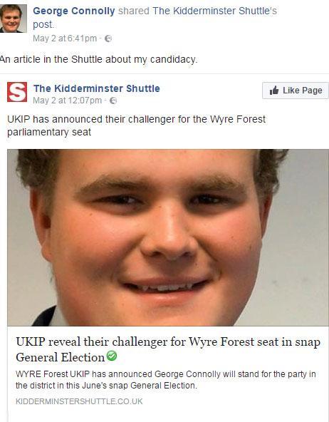 And, on 2 May, he was posting a link to “an article in the Shuttle about my candidacy.” The first words of the article in the Kidderminster Shuttle local newspaper were: “Wyre Forest Ukip has announced George Connolly will stand for the party in the district in this June’s snap General Election.”
