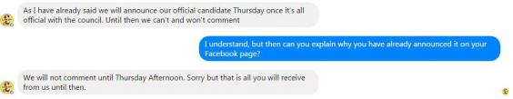 We asked them to explain why they seemed to be refusing to announce what they and their candidate already appeared to have announced, but were told: "We will not comment until Thursday afternoon. Sorry but that is all you will receive from us until then."