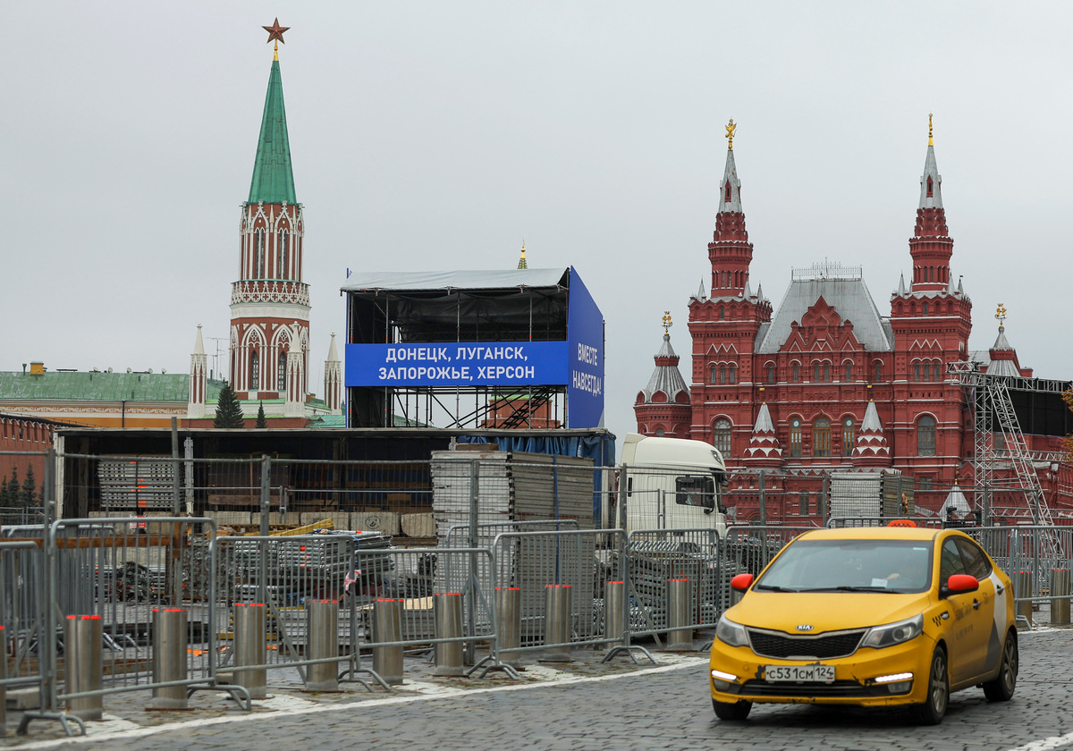 On Moscow's Red Square, a tribune with giant video screens has been set up, with billboards proclaiming "Donetsk, Luhansk, Zaporizhzhia, Kherson - Russia!"