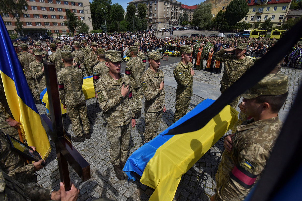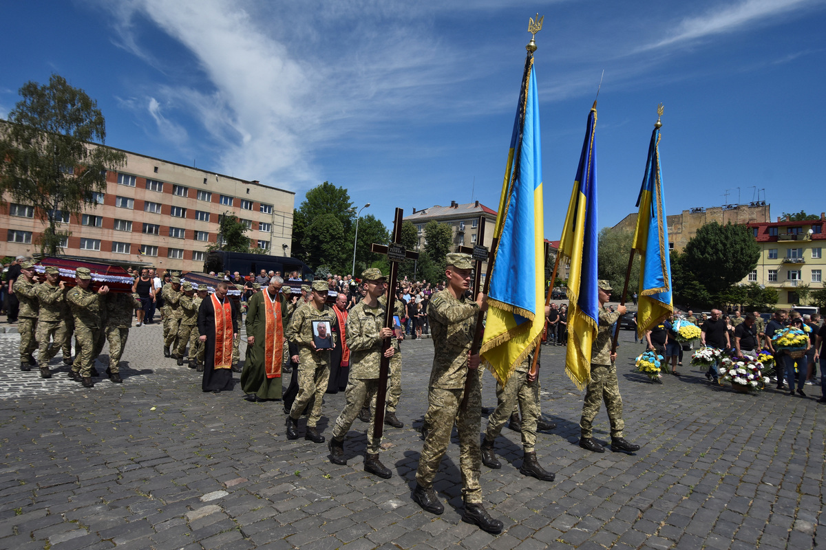 Led by one soldier carrying a cross and another holding the blue and yellow Ukrainian flag, mourners formed a procession behind Zabavchuk's coffin and those of two other soldiers.