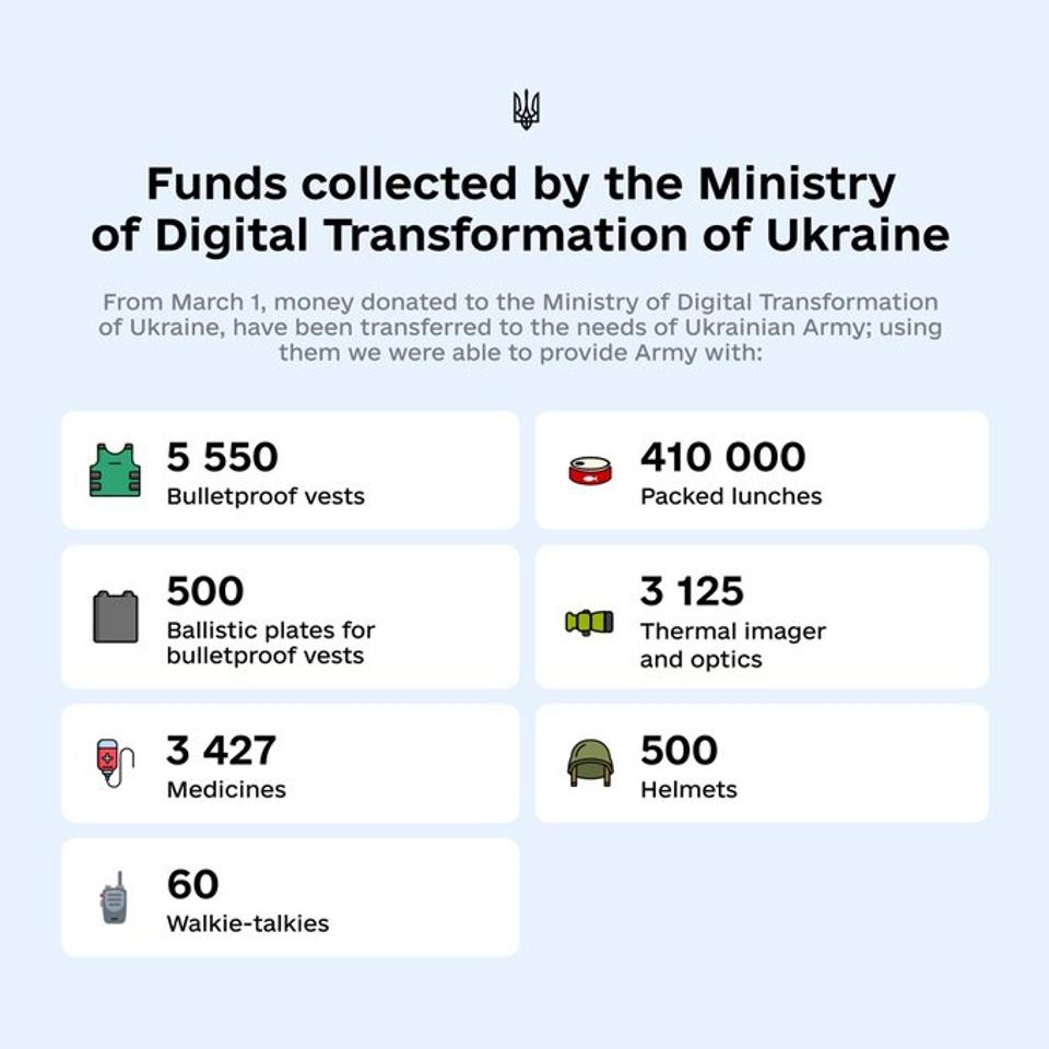 “The Ministry of Digital Transformation initiated creating the Crypto Fund of Ukraine and set up with a partnership of Kyiv-based crypto exchange KUNA, which is providing us with tech infrastructure. We were able to raise more than $50 million in crypto assets and transferred these funds into fiat currency”, according to Alex Bornyakov, the Deputy Minister of Digital Transformation of Ukraine.