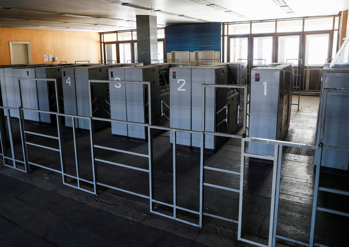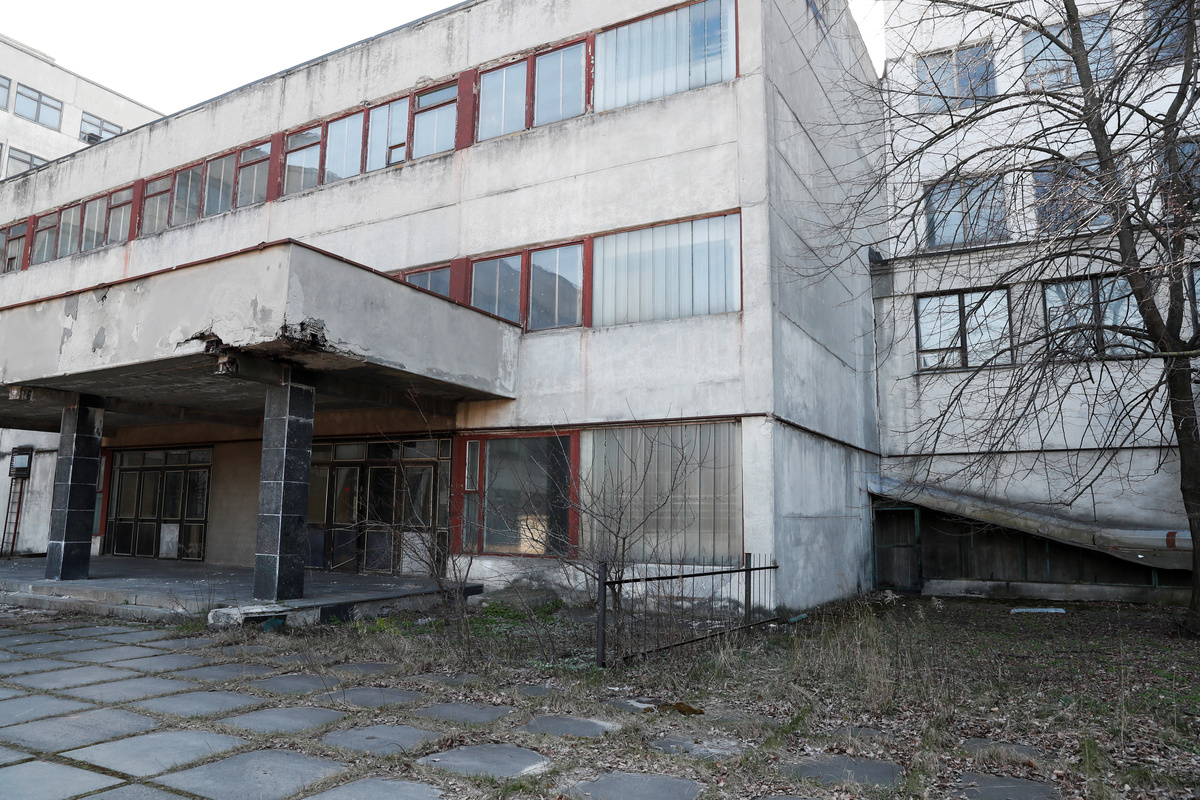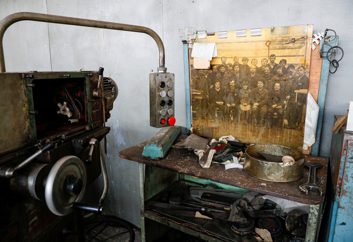A handful of employees remain, including its acting director and security guards. The power and heating were cut off five years ago. The plaster on the walls is cracked and old machinery lies covered in dust.