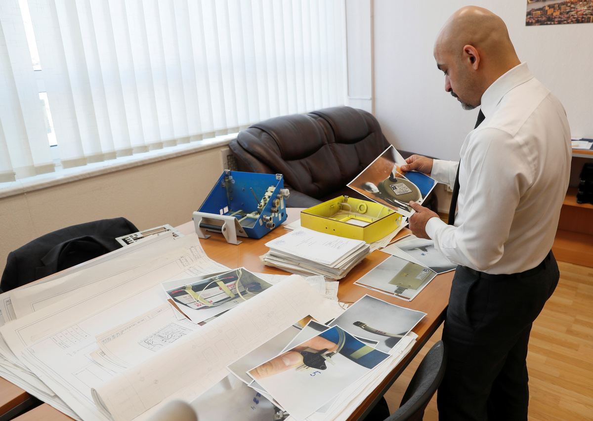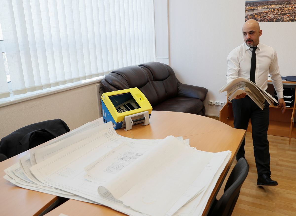 Deputy Director General of Ukroboronprom Mustafa Nayyem shows the instructions and designs of an old ventilator, after the disused Burevisnyk state-run military plant was chosen by local authorities as the domestic producer of ventilators amid the outbreak of coronavirus disease (COVID-19), in his office in Kiev, Ukraine March 26, 2020. REUTERS/Gleb Garanich