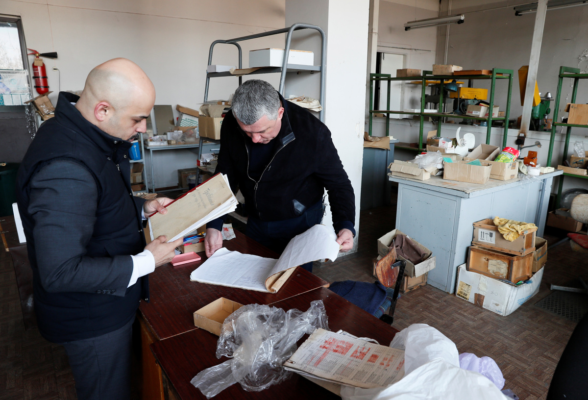 Deputy Director General of Ukroboronprom Mustafa Nayyem and the plant's Acting Director Vitaly Khodzitsky look at old designs and instructions at the disused Burevisnyk state-run military plant, which is considered by local authorities as the domestic producer of ventilators amid the outbreak of coronavirus disease (COVID-19), in Kiev, Ukraine March 26, 2020. REUTERS/Gleb Garanich